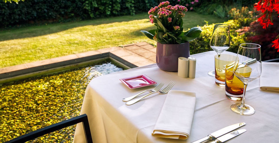 Avec les beaux jours, le restaurant s'agrandit pour vous faire profiter d'une terrasse privée et extraordinaire. Par beaux temps profitez de la nature et mangez en toute tranquillité dans notre grand jardin verdoyant avec vue sur le vignoble. Vivez des moments décontractés en observant les poissons de rivière dans l’étang et en écoutant le chant des grenouilles. Le restaurant Mathes est tout simplement un des plus beaux restaurant de la moselle, avec un grand espace et des baies vitrées tout en hauteur qui offrent un panorama sans concession sur le magnifique paysage.