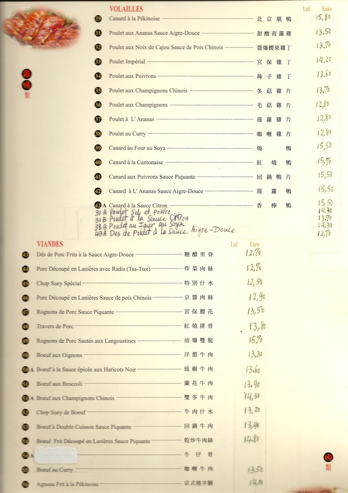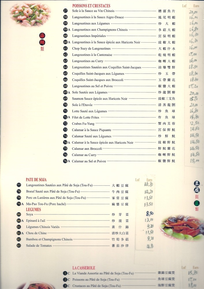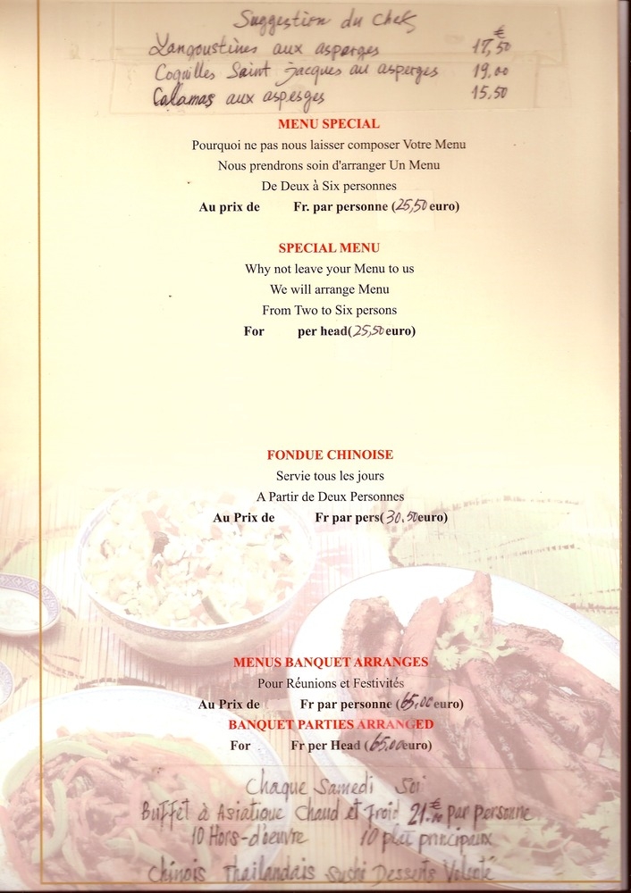 Une dynastie qui dure et qui, désormais, ajoute à la traditionnelle cuisine chinoise un volet important de spécialités thaïlandaises. On suit – un peu - les saisons avec les suggestions du chef mais l’attrait de l’établissement est incontestablement la paisible terrasse entourée de vieux murs où le seul bruit perceptible est le chant d’un mainate résidant sur un balcon des alentours.